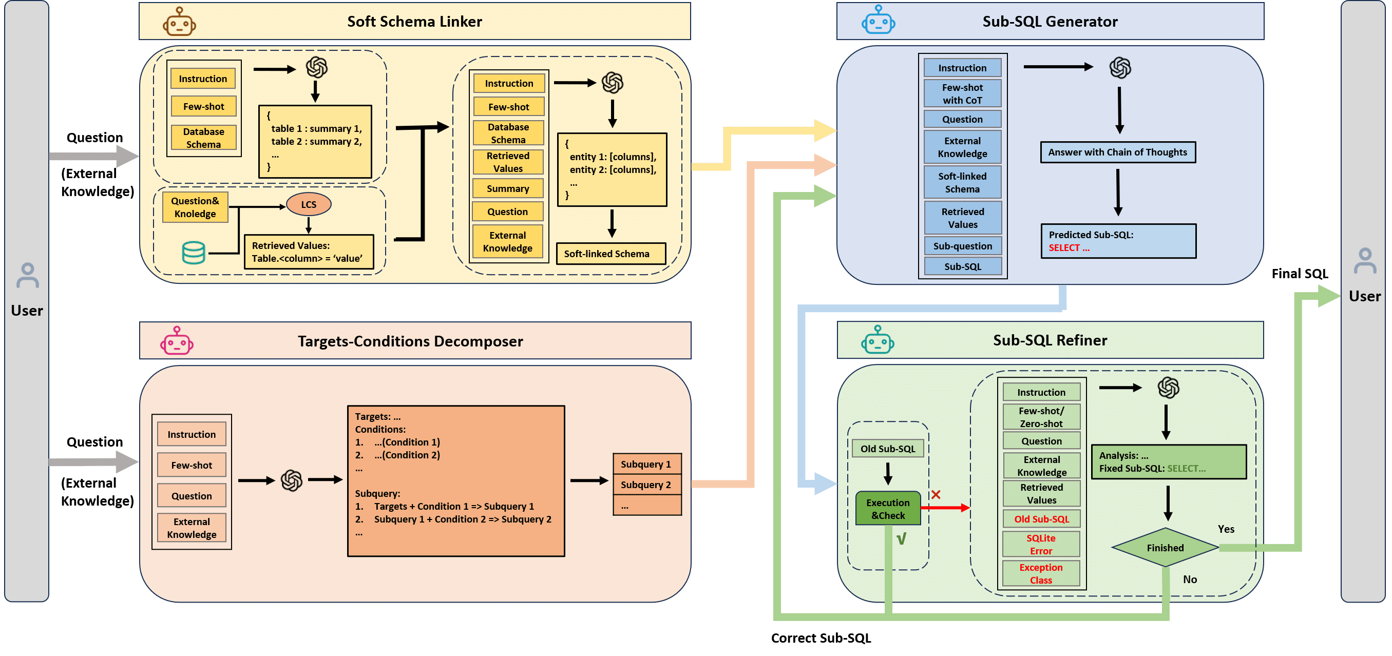MAG-SQL introduces a multi-agent generative framework designed to improve Text-to-SQL performance, particularly on complex datasets like BIRD. Key features include soft schema linking, a targets-conditions decomposition method for handling complex queries, and iterative Sub-SQL refinement through a generator and refiner module. MAG-SQL achieves an impressive execution accuracy of 61.08% on BIRD, surpassing the performance of vanilla GPT-4 (46.35%) and MAC-SQL (57.56%).
